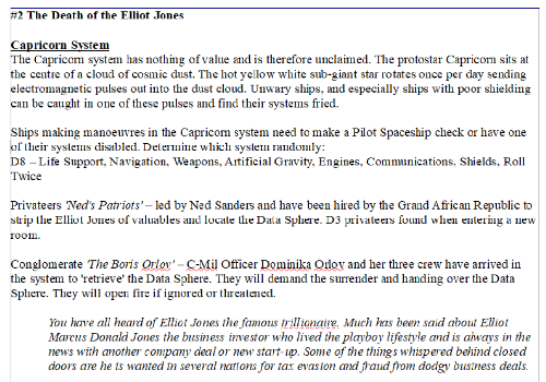 I ran a short vignette to get them to meet with a contact from ESS officially hiring them for the mission, providing them with a spaceship, the ESSS-Amelia, and allowed them to ask questions (Charisma check) or do some research on the Holonet (Science check). This was essentially a bit of role-playing as I gave them a data-stick which they could plug into the ship which would not only give them coordinates to head to but provide them all the relevant information as follows: