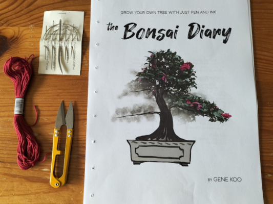 I first came across The Bonsai Diary in a thread on the Ludonarrative Dissidents discord channel. The premise of the game took my interest and I decided to pick up a pdf copy for myself. On a quick read through it was obvious that the document was to be printed double sided on thin paper and bound along the left hand long edge. Although I print and bind a lot of my gaming material using plastic ring binders, I was wondering if there was a way of “stitch binding” the pages together in a pleasing arts-and-crafts kind of way.